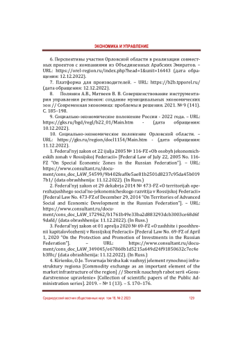 1. Федеральный закон от 22 июля 2005 № 116-ФЗ “Об особых экономических зонах в Российской Федерации”. - URL: https://www.consultant.ru/document/cons_doc_LAW_54599/9b402feaf0e5ae81b2501d8237c95da45b0197b1/(дата обращения: 11.12.2022).