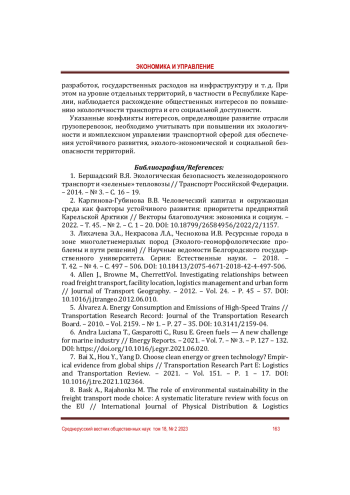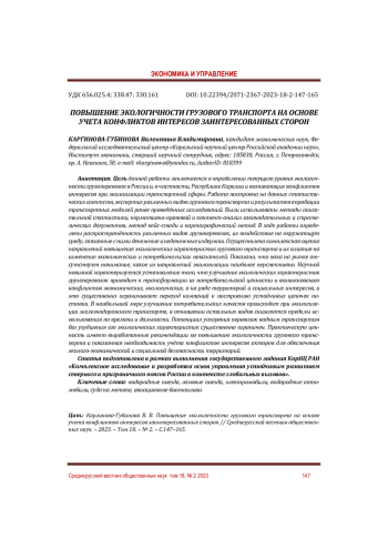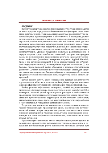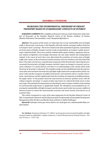 Цель данной работы заключается в определении текущего уровня экологичности грузоперевозок в России и, в частности, Республике Карелии и возникающих конфликтов интересов при экологизации транспортной сферы. Работа построена на данных статистических агентств, экспертиз различных видов грузового транспорта и результатов апробации транспортных моделей ранее проведённых исследований. Были использованы методы описательной статистики, нормативно-правовой и контент-анализ законодательных и стратегических документов, метод кейс-стади и картографический метод. В ходе работы определены распространённость различных видов грузоперевозок, их воздействие на окружающую среду, связанные с ними денежные и неденежные издержки. Осуществлена комплексная оценка направлений повышения экологических характеристик грузового транспорта и их влияния на изменение экономических и потребительских показателей. Показано, что пока на рынке отсутствует понимание, какое из направлений экологизации наиболее перспективно. Научной новизной характеризуется установление того, что улучшение экологических характеристик грузоперевозок приводит к трансформации их потребительской ценности и возникновению конфликтов экономических, экологических, а на ряде территорий и социальных интересов, и это существенно ограничивает переход компаний к построению устойчивых цепочек поставки. В наибольшей мере улучшение потребительских качеств происходит при экологизации железнодорожного транспорта, в отношении остальных видов снижаются пределы использования по времени и дальности. Потенциал ускорения перевозок водным транспортом без ухудшения его экологических характеристик существенно ограничен. Практическую ценность имеют выработанные рекомендации по повышению экологичности грузового транспорта и показанная необходимость учёта конфликтов интересов акторов для обеспечения эколого-экономической и социальной безопасности территорий.