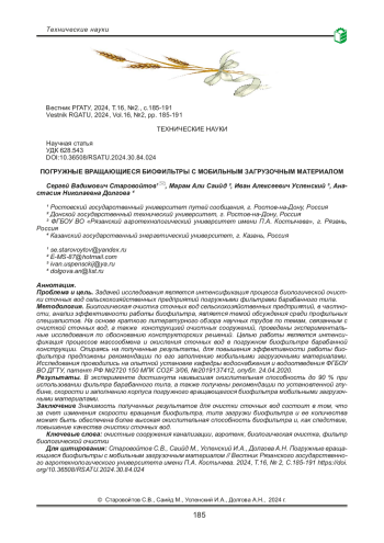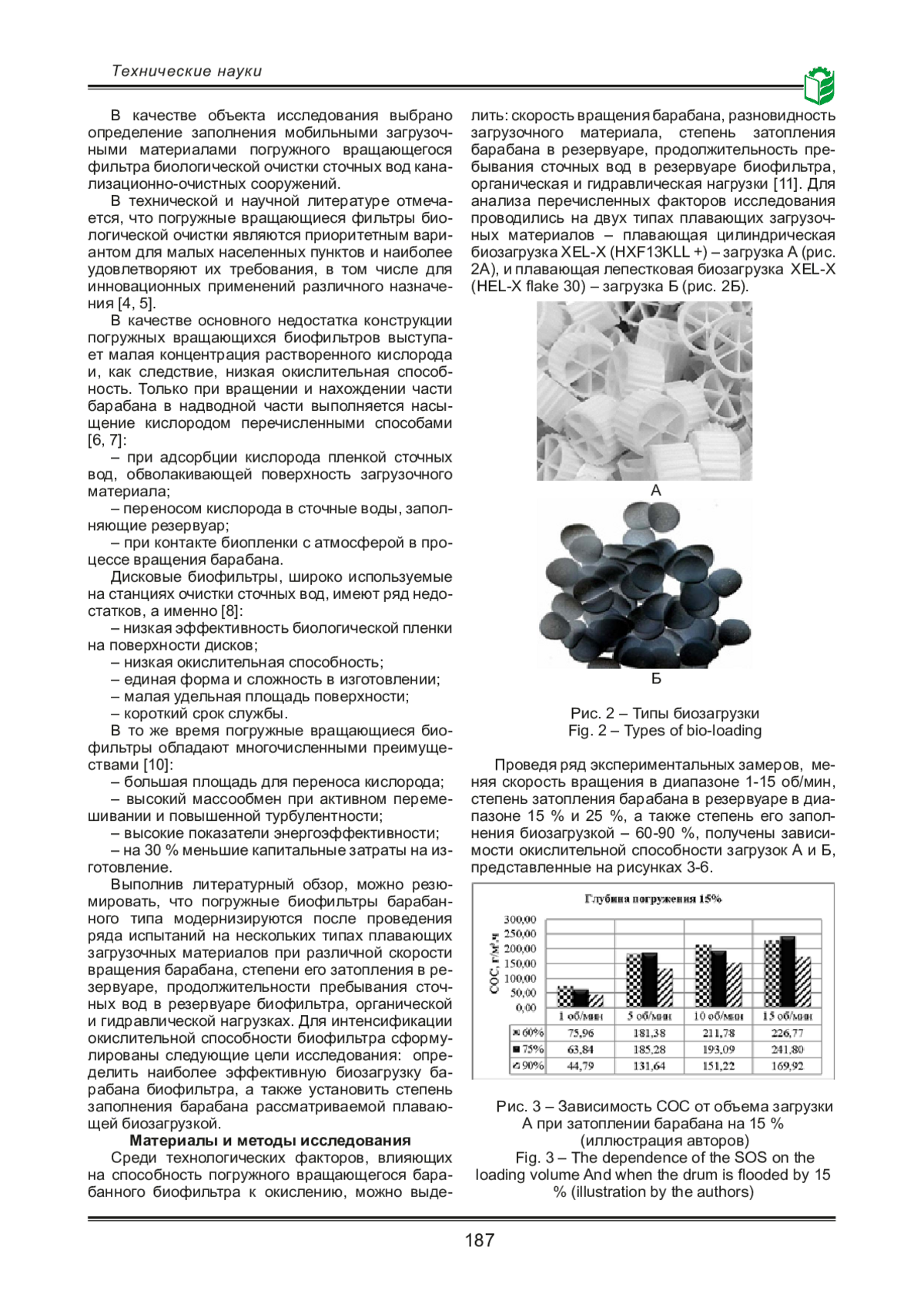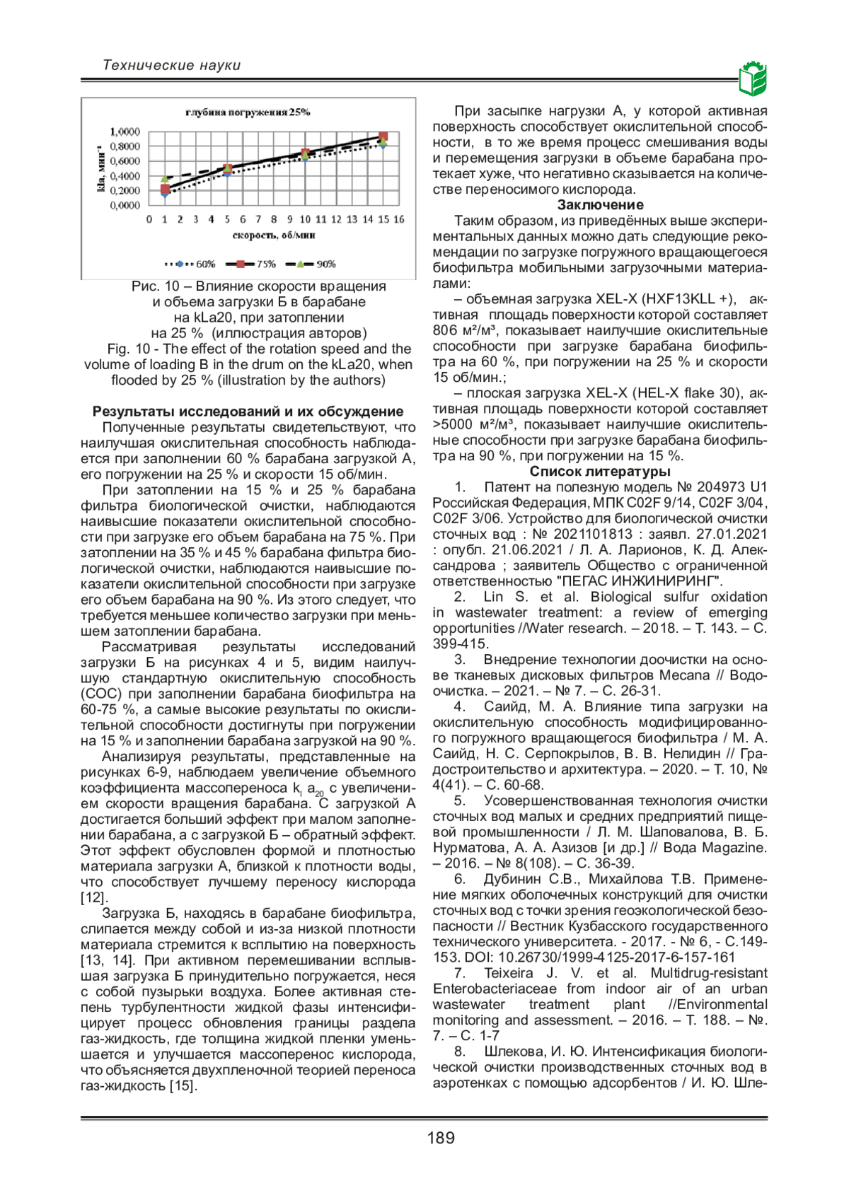 Заключение. Значимость полученных результатов для очистки сточных вод состоит в том, что за счет изменения скорости вращения биофильтра, типа загрузки биофильтра и ее количества может быть обеспечена более высокая окислительная способность биофильтра и, как следствие, повышение качества очистки сточных вод.