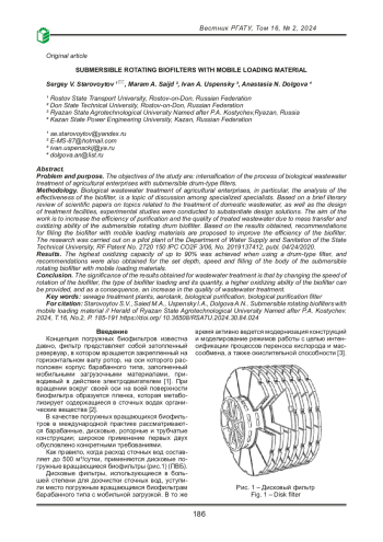 Методология. Биологическая очистка сточных вод сельскохозяйственных предприятий, в частности, анализ эффективности работы биофильтра, является темой обсуждения среди профильных специалистов. На основе краткого литературного обзора научных трудов по темам, связанным с очисткой сточных вод, а также конструкцией очистных сооружений, проведены экспериментальные исследования по обоснованию конструкторских решений. Целью работы является интенсификация процессов массообмена и окисления сточных вод в погружном биофильтре барабанной конструкции. Опираясь на полученные результаты, для повышения эффективности работы биофильтра предложены рекомендации по его заполнению мобильными загрузочными материалами. Исследования проводились на опытной установке кафедры водоснабжения и водоотведения ФГБОУ ВО ДГТУ, патент РФ №2720 150 МПК CO2F 3/06, №2019137412, опубл. 24.04.2020.