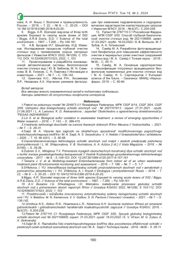 10. А.В. Бусарев И.Г. Шешегова, И.Д. Мамаков. Исследование процессов глубокой очистки сточных вод с применением скорых напорных фильтров // Известия КГАСУ 2022, №1(59). С 103112. DOI: 10.52409/20731523_2022_1_103