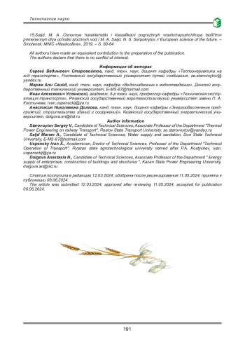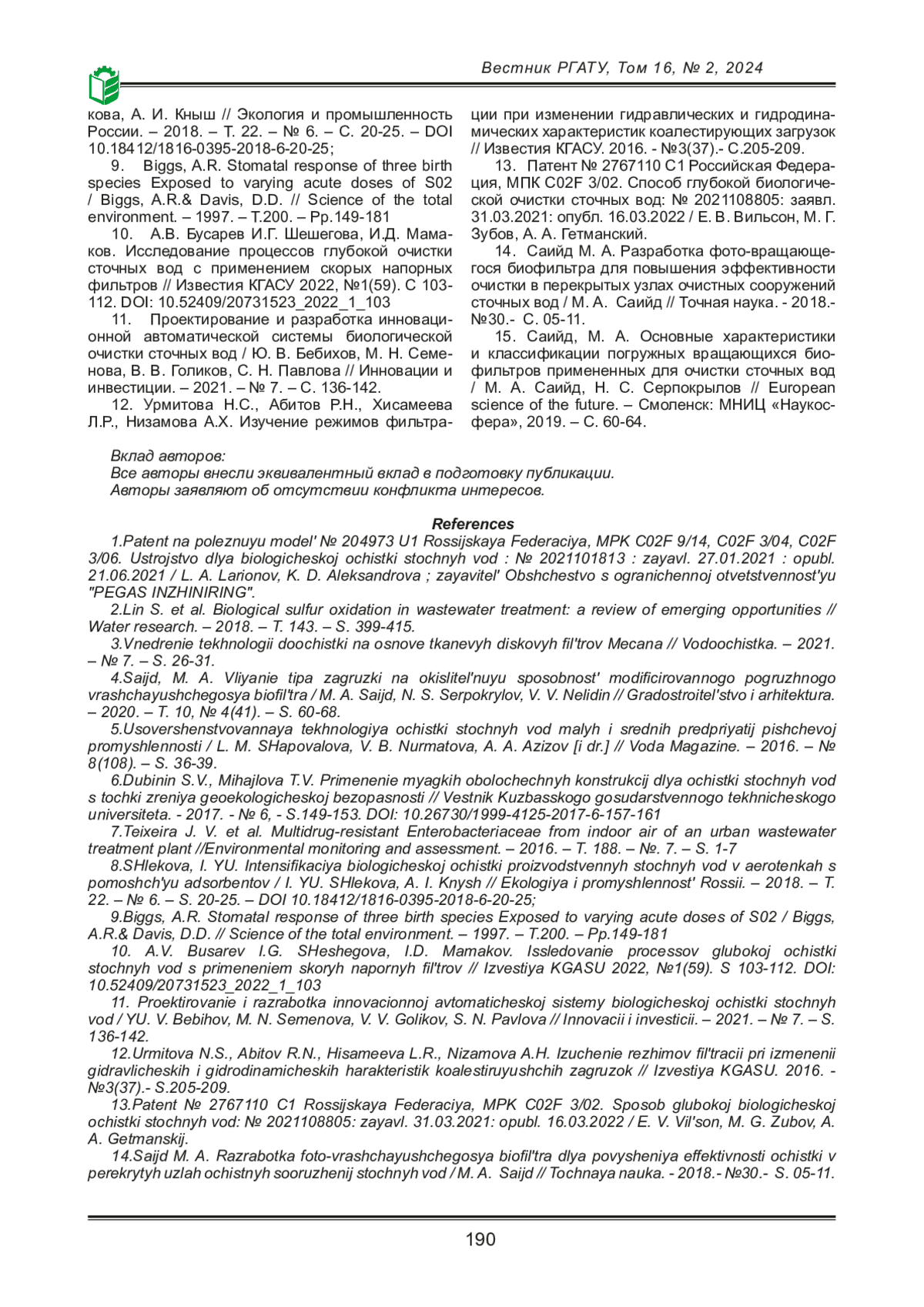 15. Саийд, М. А. Основные характеристики и классификации погружных вращающихся биофильтров примененных для очистки сточных вод /М. А. Саийд, Н. С. Серпокрылов // European science of the future. - Смоленск: МНИЦ “Наукосфера”, 2019. - С. 60-64. EDN: TUZSRO