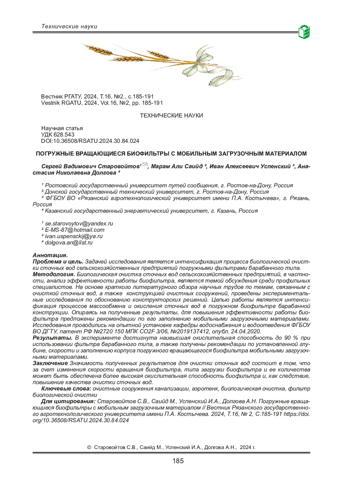 4. Саийд, М. А. Влияние типа загрузки на окислительную способность модифицированного погружного вращающегося биофильтра /М. А. Саийд, Н. С. Серпокрылов, В. В. Нелидин // Градостроительство и архитектура. - 2020. - Т. 10, № 4(41). - С. 60-68.