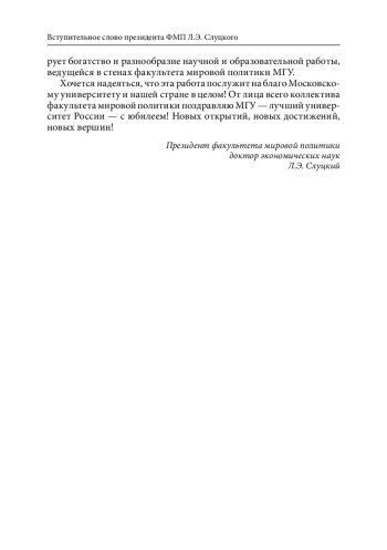 В некотором смысле предлагаемый вниманию читателя выпуск можно рассматривать как своеобразную визитную карточку факультета мировой политики МГУ. В номере представлены труды как опытных исследователей и преподавателей, являющихся признанными специалистами в своих предметных областях, так и молодых сотрудников ФМП, нового поколения российских международников, подготовленных факультетом и продолжающих лучшие традиции Московского университета.