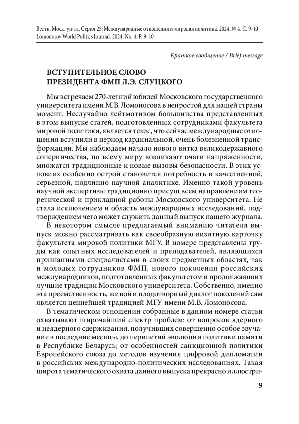 Для цитирования: Слуцкий Л. Э. Вступительное слово президента ФМП Л. Э. Слуцкого. Вестник Московского Университета. Серия XXV. Международные отношения и мировая политика. 2024;16(4):9-10.
