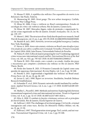 49. Lins I., Machado C. O crime é político: Elementos teóricos para uma análise neoinstitucionalista das milícias no Rio de Janeiro // Revista Brasileira de Ciência Política. 2023. No. 42. P. 1‒33. https://doi.org/10.1590/01033352.2023.42.271780.
