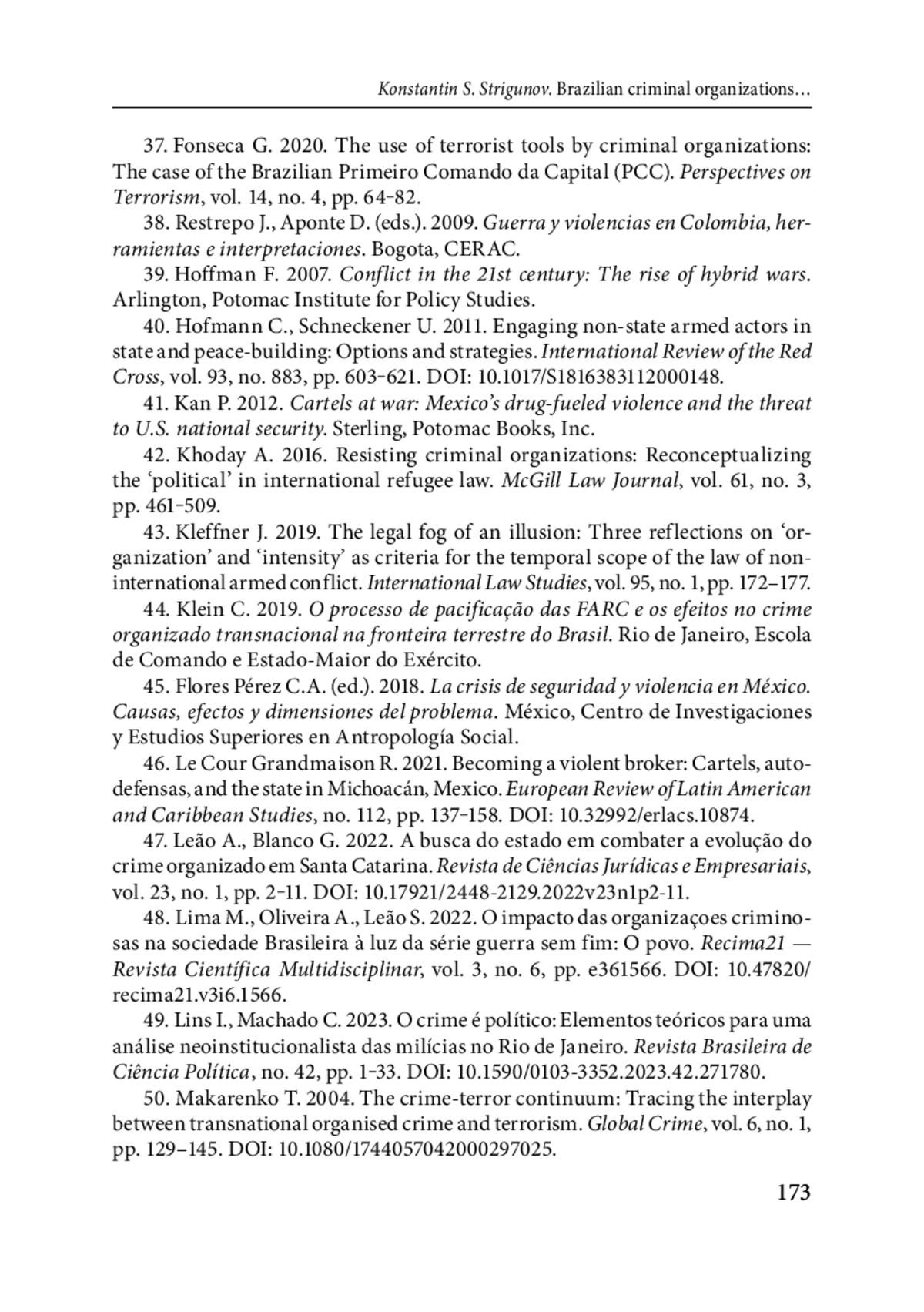 5. Клебанов Л.Р., Полубинская С.В. Преступность в Бразилии: особенности, противодействие, направления исследований // Вестник Томского государственного университета. 2022. № 474. С. 299-310. https://doi.org/10.17223/15617793/474/32.