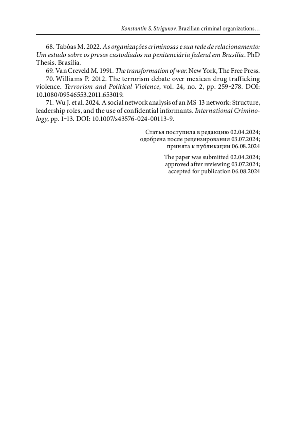71. Wu J. et al. A social network analysis of an MS-13 network: Structure, leadership roles, and the use of confidential informants // International Criminology. 2024. P. 1-13. https://doi.org/10.1007/s43576-024-00113-9.
