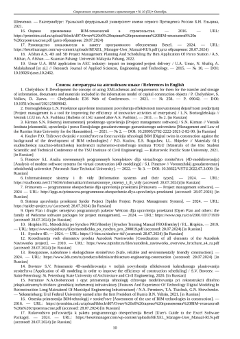 5. Pimenov S.I. Analiz sovremennyh programmnyh kompleksov dlja virtual’nogo stroitel’stva (4D-modelirovanija) [Analysis of modern software systems for virtual construction (4D modeling)] / S.I. Pimenov // Voronezhskij gosudarstvennyj tehnicheskij universitet [Voronezh State Technical University]. — 2022. — № 3. — DOI: 10.36622/VSTU.2022.67.3.009. [in Russian]