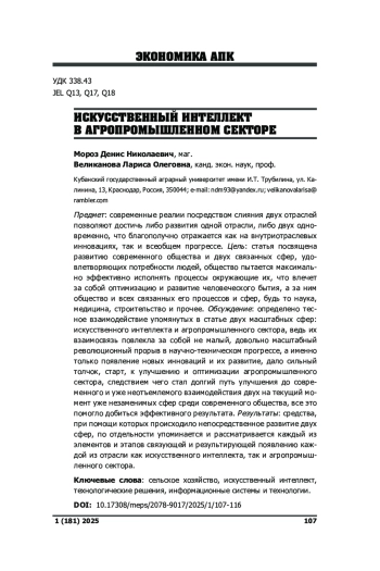 Предмет: современные реалии посредством слияния двух отраслей позволяют достичь либо развития одной отрасли, либо двух одновременно, что благополучно отражается как на внутриотраслевых инновациях, так и всеобщем прогрессе. Цель: статья посвящена развитию современного общества и двух связанных сфер, удовлетворяющих потребности людей, общество пытается максимально эффективно исполнять процессы окружающие их, что влечет за собой оптимизацию и развитие человеческого бытия, а за ним общество и всех связанных его процессов и сфер, будь то наука, медицина, строительство и прочее. Обсуждение: определено тесное взаимодействие упомянутых в статье двух масштабных сфер: искусственного интеллекта и агропромышленного сектора, ведь их взаимосвязь повлекла за собой не малый, довольно масштабный революционный прорыв в научно-техническом прогрессе, а именно только появление новых инноваций и их развитие, дало сильный толчок, старт, к улучшению и оптимизации агропромышленного сектора, следствием чего стал долгий путь улучшения до современного и уже неотъемлемого взаимодействия двух на текущий момент уже незаменимых сфер среди современного общества, все это помогло добиться эффективного результата. Результаты: средства, при помощи которых происходило непосредственное развитие двух сфер, по отдельности упоминается и рассматривается каждый из элементов и этапов связующей и результирующей появлению каждой из отрасли как искусственного интеллекта, так и агропромышленного сектора.