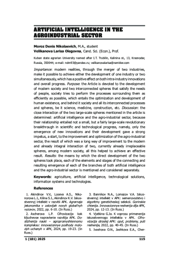 1. Акиндинов В.В., Лосева А.С., Никонорова Л.И., Килина С.И., Акиндинов К.В. Искусственный интеллект в развитии АПК // Аграрная экономика в условиях новых глобальных вызовов, 2022, с. 6-10. EDN: VAFHBJ