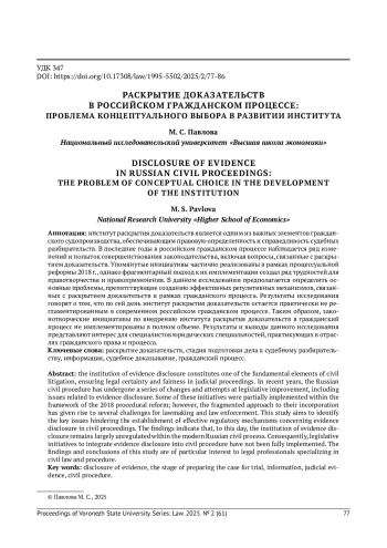 Институт раскрытия доказательств является одним из важных элементов гражданского судопроизводства, обеспечивающим правовую определенность и справедливость судебных разбирательств. В последние годы в российском гражданском процессе наблюдается ряд изменений и попыток совершенствования законодательства, включая вопросы, связанные с раскрытием доказательств. Упомянутые инициативы частично реализованы в рамках процессуальной реформы 2018 г., однако фрагментарный подход к их имплементации создал ряд трудностей для правотворчества и правоприменения. В данном исследовании предполагается определить основные проблемы, препятствующие созданию эффективных регулятивных механизмов, связанных с раскрытием доказательств в рамках гражданского процесса. Результаты исследования говорят о том, что по сей день институт раскрытия доказательств остается практически не регламентированным в современном российском гражданском процессе. Таким образом, законотворческие инициативы по внедрению института раскрытия доказательств в гражданский процесс не имплементированы в полном объеме. Результаты и выводы данного исследования представляют интерес для специалистов юридических специальностей, практикующих в отраслях гражданского права и процесса.