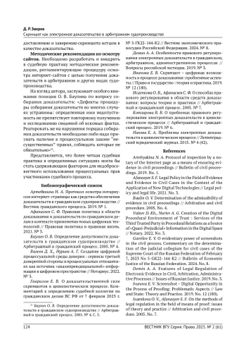 1. Артебякина Н. А. Протокол осмотра нотариусом интернет-страницы как средство обеспечения доказательств в гражданском судопроизводстве // Вестник гражданского процесса. 2019. № 1. EDN: VWRUKY