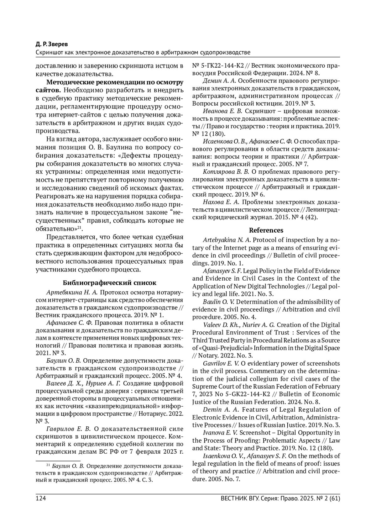 5. Гаврилов Е. В. О доказательственной силе скриншотов в цивилистическом процессе. Комментарий к определению судебной коллегии по гражданским делам ВС РФ от 7 февраля 2023 г.№ 5-ГК22-144-К2 // Вестник экономического правосудия Российской Федерации. 2024. № 8.