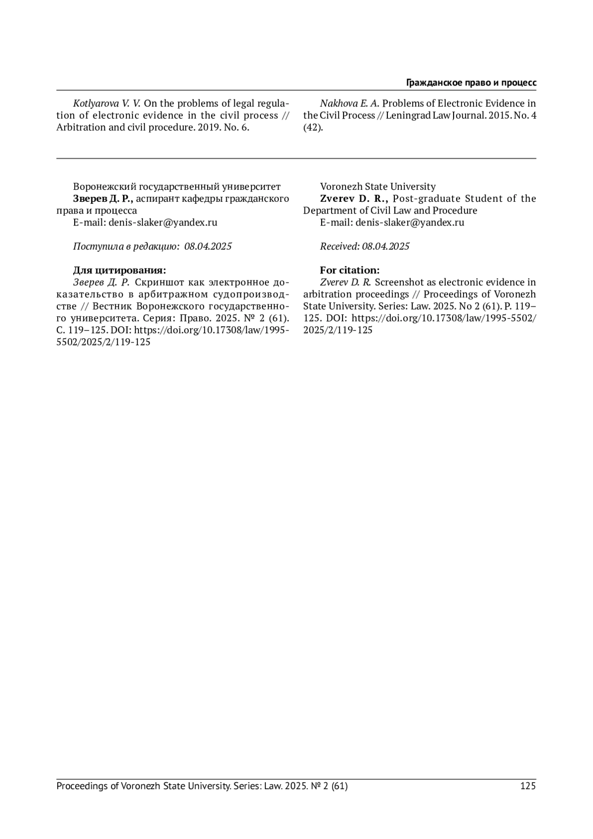 9. Котлярова В. В. О проблемах правового регулирования электронных доказательств в цивилистическом процессе // Арбитражный и гражданский процесс. 2019. № 6. EDN: IIVRCD