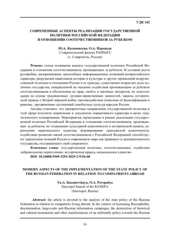 КАЗАНОВСКАЯ Ю. А., ПЕРЕПАДЯ О.А. СОВРЕМЕННЫЕ АСПЕКТЫ РЕАЛИЗАЦИИ ГОСУДАРСТВЕННОЙ ПОЛИТИКИ РОССИЙСКОЙ ФЕДЕРАЦИИ В ОТНОШЕНИИ СООТЕЧЕСТВЕННИКОВ ЗА РУБЕЖОМ // ВОПРОСЫ ГОСУДАРСТВА И ПРАВА. 2025. № 2 (9)