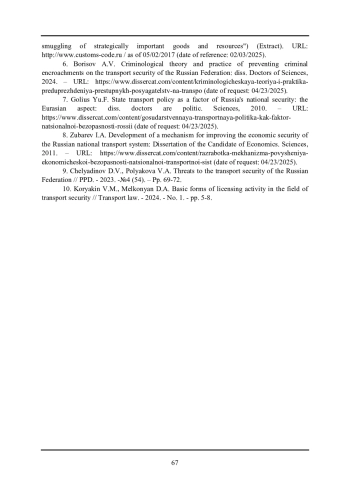 6. Борисов А.В. Криминологическая теория и практика предупреждения преступных посягательств на транспортную безопасность Российской Федерации: дисс. доктора наук, 2024. - URL: https://www.dissercat.com/content/kriminologicheskaya-teoriya-i-praktika-preduprezhdeniya-prestupnykh-posyagatelstv-na-transpo (дата обращения: 23.04.2025).