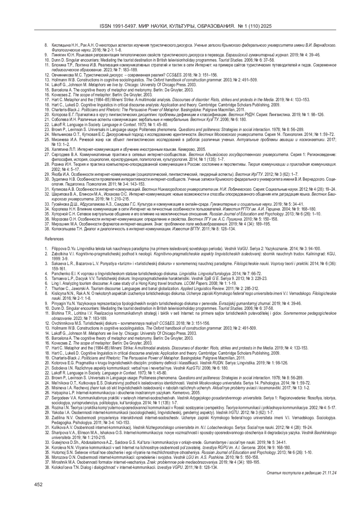 11. Блохина Т.Р., Лохтина И.В. Реализация коммуникативных стратегий и тактик в сети Интернет: на примере сайтов туристических путеводителей и гидов. Современное педагогическое образование. 2023; № 7: 183-189. EDN: ZVSGDZ