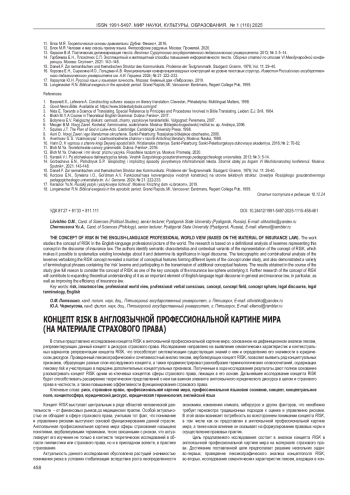 Ключевые фразы: риск, страховое право, профессиональная картина мира, профессиональное языковое сознание, концепт, концептуальное поле, КОНЦЕПТОСФЕРА, юридический дискурс, ЮРИДИЧЕСКАЯ ТЕРМИНОЛОГИЯ, английский язык
