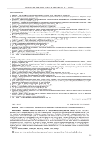 В статье проанализированы формы и способы использования в творчестве Державина персонажей, наделенных способностью полета, как реальных, так и фантастических, с выделением основной группы пернатых существ - птиц с точки зрения поэтики и аксиологии их включения в произведения разных жанров. Многоаспектность семантики и ценностных значений крылатых персонажей в поэтических произведениях разных жанров демонстрирует новые грани богатства поэтики Державина, соединяющей черты классицистических канонов с сентименталистскими мотивами и реалистическими деталями. Данное исследование творчества ГР Державина, охватившее все его поэтические жанры, позволяет наглядно продемонстрировать присущее поэту многообразие художественных форм воплощения «пернатых» персонажей в виде метафор, сравнений и перифраз, выражающих как традиционно классицистические символические смыслы, так и идиллические сентименталистские эмоции любования природой, наряду с ироническими и откровенно сатирическими трактовками в духе басенной аллегории. Расширение анализа на материале новых групп природных образов и персонажей позволит выявить новые черты художественной картины мира Г. Р. Державина и обогатит наше представление о его творчестве.