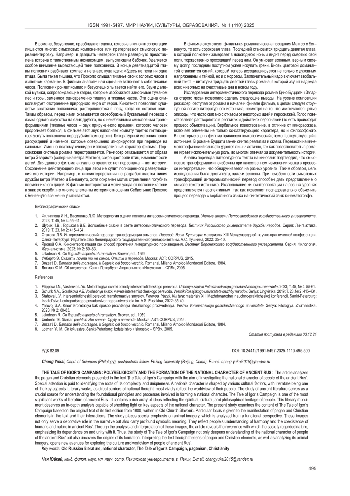 В данной статье анализируются языческие и христианские элементы, представленные в тексте «Слова о полку Игореве», с целью исследования национального характера древнерусского народа. Особое внимание уделяется выявлению корней его сложности и уникальности. Национальный характер народа формируется под влиянием различных культурных факторов, и одним из ключевых аспектов является литература. Литературные произведения, являясь прямыми носителями национальной мысли, наиболее ярко отражают мировоззрение своего народа. Изучение древней литературы представляет собой важнейший источник для понимания базовых принципов и процессов формирования национального характера. «Слово о полку Игореве» - одно из наиболее значимых произведений древнерусской литературы. Оно содержит богатый пласт идей, отражающих духовное, культурное и мировоззренческое наследие древнерусского народа. Этот памятник заслуживает углублённого анализа, способного пролить свет на ключевые аспекты национального характера. В данной работе анализируется содержание «Слова о полку Игореве» на основе оригинального текста первого издания 1800 года, выполненного на старославянском языке. Основное внимание уделено проявлению в тексте языческих и христианских элементов, а также их взаимодействию. Особое место в исследовании занимают образы животных, которые рассматриваются с функциональной точки зрения. Они выполняют не только декоративную функцию в сюжете, но и несут глубокую символическую нагрузку, отражают представления древнерусского народа о гармонии и сосуществовании человека и природы. Посредством анализа и интерпретации этих образов в статье раскрывается благоговейное отношение древнерусского общества к природе, подчёркивается его зависимость от неё и единство с ней. Таким образом, исследование «Слова о полку Игореве» позволяет не только углубить понимание национального характера древнерусского народа, но и проникнуть в истоки его формирования. Интерпретация текста через призму языческих и христианских элементов, а также анализ животного мира открывают новые перспективы для изучения культуры и мировоззрения древней Руси.