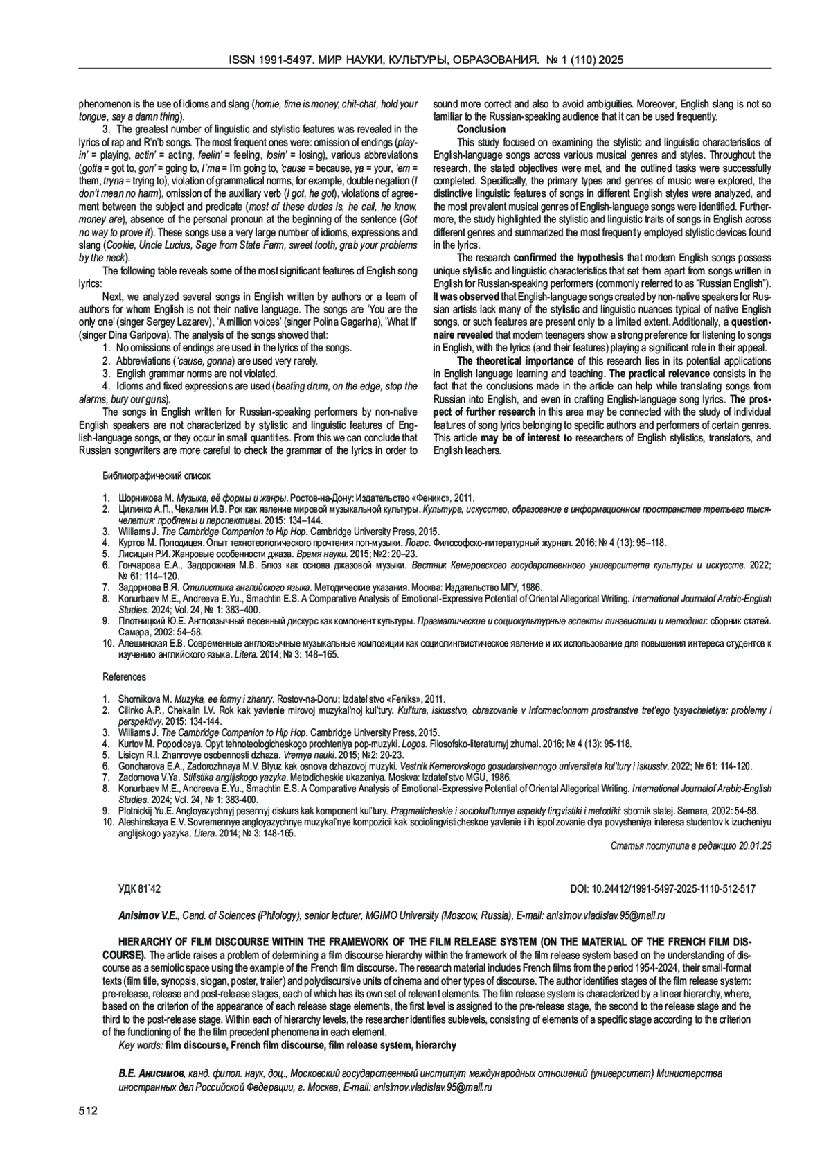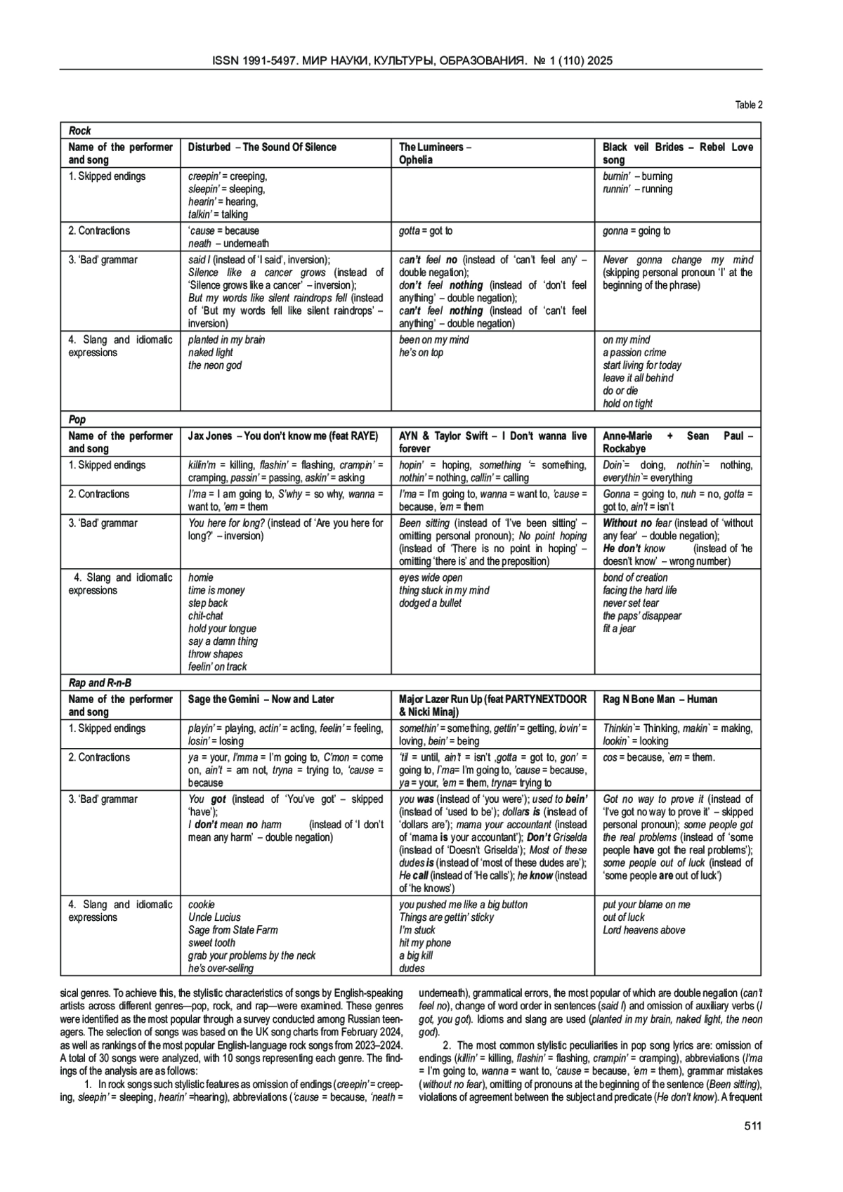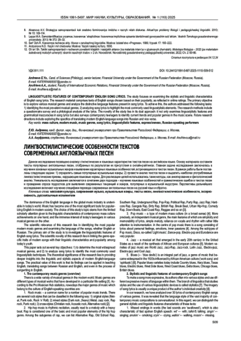 Ключевые фразы: mass culture, modern music, music genres, song lyrics, linguostylistic features, expressiveness, russian-speaking performers, массовая культура, современная музыка, музыкальные жанры, тексты песен, лингвостилистические особенности, русскоязычные исполнители, экспрессивность