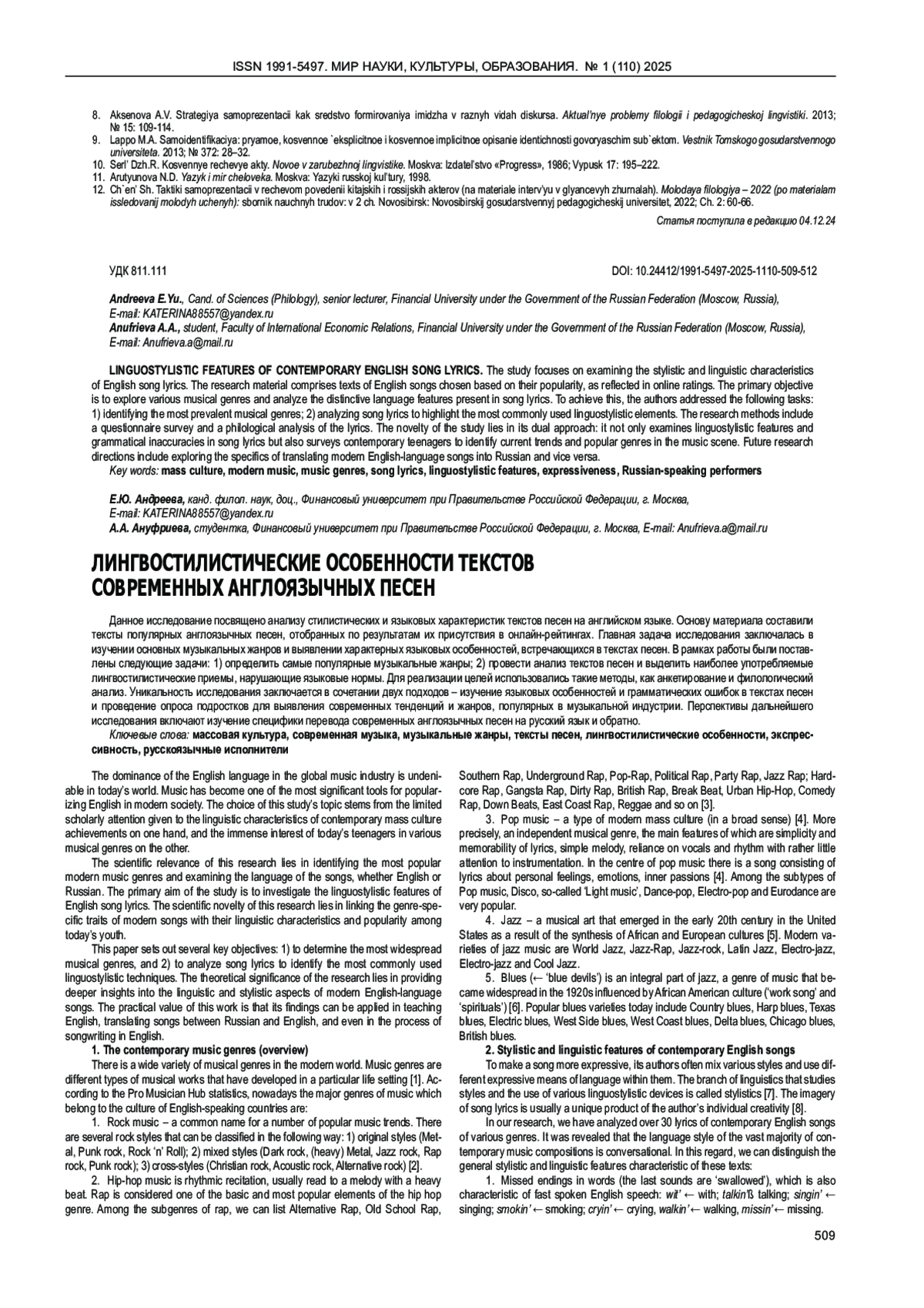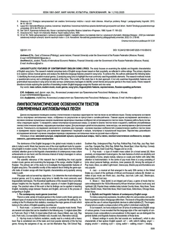 АНДРЕЕВА Е. Ю., АНУФРИЕВА А. А. ЛИНГВОСТИЛИСТИЧЕСКИЕ ОСОБЕННОСТИ ТЕКСТОВ СОВРЕМЕННЫХ АНГЛОЯЗЫЧНЫХ ПЕСЕН // МИР НАУКИ, КУЛЬТУРЫ, ОБРАЗОВАНИЯ. 2025. № 1 (110)