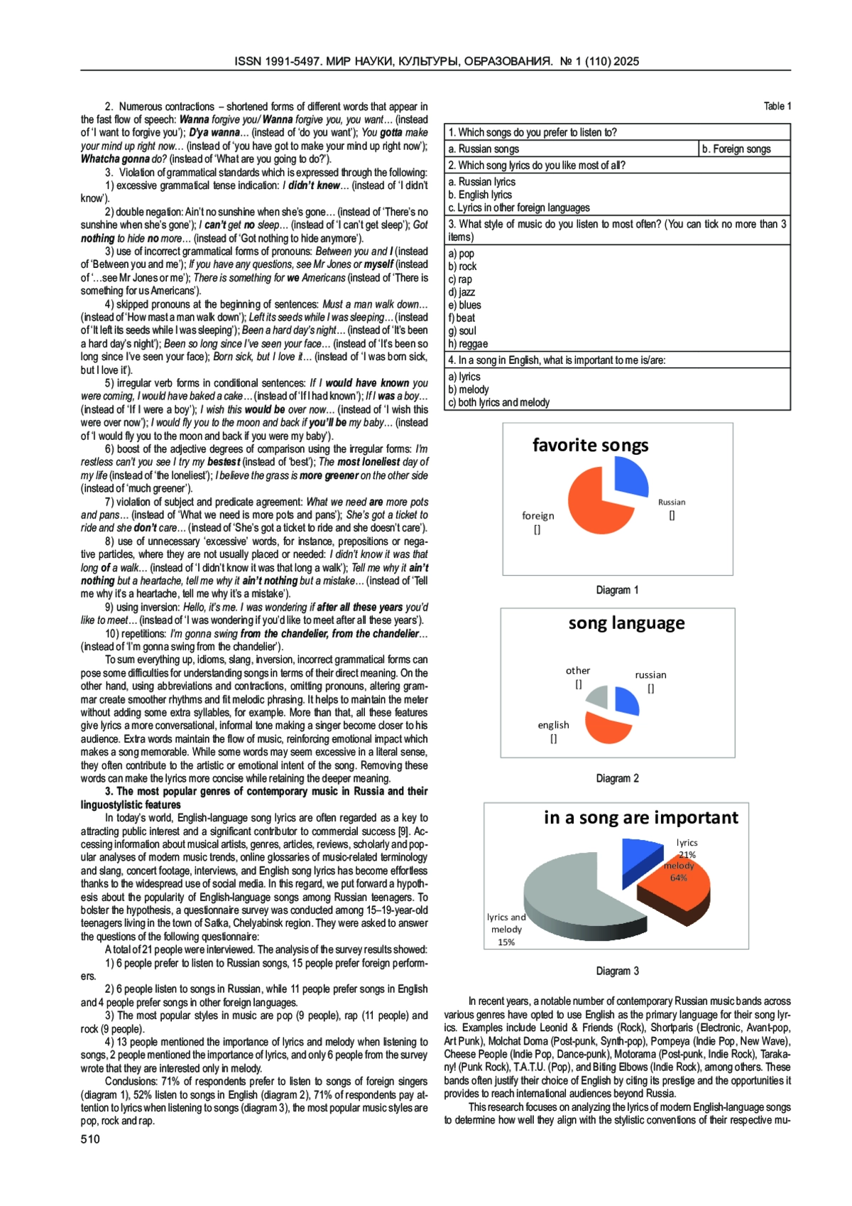 Данное исследование посвящено анализу стилистических и языковых характеристик текстов песен на английском языке. Основу материала составили тексты популярных англоязычных песен, отобранных по результатам их присутствия в онлайн-рейтингах. Главная задача исследования заключалась в изучении основных музыкальных жанров и выявлении характерных языковых особенностей, встречающихся в текстах песен. В рамках работы были постав лены следующие задачи: 1) определить самые популярные музыкальные жанры; 2) провести анализ текстов песен и выделить наиболее употребляемые лингвостилистические приемы, нарушающие языковые нормы. Для реализации целей использовались такие методы, как анкетирование и филологический анализ. Уникальность исследования заключается в сочетании двух подходов – изучение языковых особенностей и грамматических ошибок в текстах песен и проведение опроса подростков для выявления современных тенденций и жанров, популярных в музыкальной индустрии. Перспективы дальнейшего исследования включают изучение специфики перевода современных англоязычных песен на русский язык и обратно.