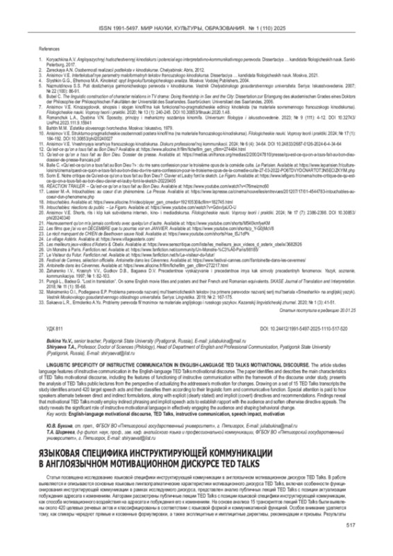 Статья посвящена исследованию языковой специфики инструктирующей коммуникации в англоязычном мотивационном дискурсе TED Talks. В работе выявляются и описываются основные языковые лингвопрагматические характеристики мотивационного дискурса TED Talks, включая особенности функционирования инструктирующей коммуникации в рамках исследуемого дискурса, представлен анализ публичных лекций TED Talks c позиции актуализации побуждения адресата к изменениям. Авторами рассмотрены публичные лекции TED Talks с позиции языковой специфики инструктирующей коммуникации, как способа мотивационного воздействия на адресата и побуждения его к изменениям. На основе анализа 15 транскриптов лекций TED Talks были выявлены около 420 целевых речевых актов и классифицированы в соответствии с языковой формой и коммуникативной функцией. Особое внимание уделяется тому, как спикеры чередуют прямые и косвенные формулировки, а также эксплицитные и имплицитные директивы, рекомендации и призывы. Результаты исследования показывают, что инструктирующая коммуникация в мотивационном дискурсе TED Talks преимущественно актуализирована косвенными, имплицитными речевыми актами. Такая особенность продиктована намерением спикера TED установить доверительные отношения с аудиторией и смягчить директивный тон обращения. Это способствует эффективному вовлечению аудитории и формированию определённых поведенческих изменений для реализации ключевых намерений мотивационных спикеров.