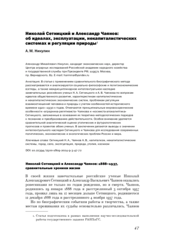 В статье с применением сравнительного биографического метода рассматриваются и анализируются социально-философские и политэкономические взгляды, а также междисциплинарное интеллектуальное наследие замечательных российских ученых Н. А. Сетницкого и А. В. Чаянова по вопросам идеалов общественного развития, характеристикам капиталистических и некапиталистических экономических систем, проблемам регуляции взаимоотношений человека и природы с учетом особенностей исторического времени 1920-1930-х годов. Отмечаются принципиальные мировоззренческие особенности «аграрника-релятивиста» Чаянова и «космиста-апокалиптика» Сетницкого, заложенные в основания их теоретико-методологических подходов к познанию и преобразованию действительности. Особое внимание уделяется сравнительной аналитической оценке утопических и футурологических прогнозов и проектов обоих ученых. В заключении делаются выводы о значении интеллектуального наследия Сетницкого и Чаянова для исследования современных политических, экономических и экологических проблем России и мира.