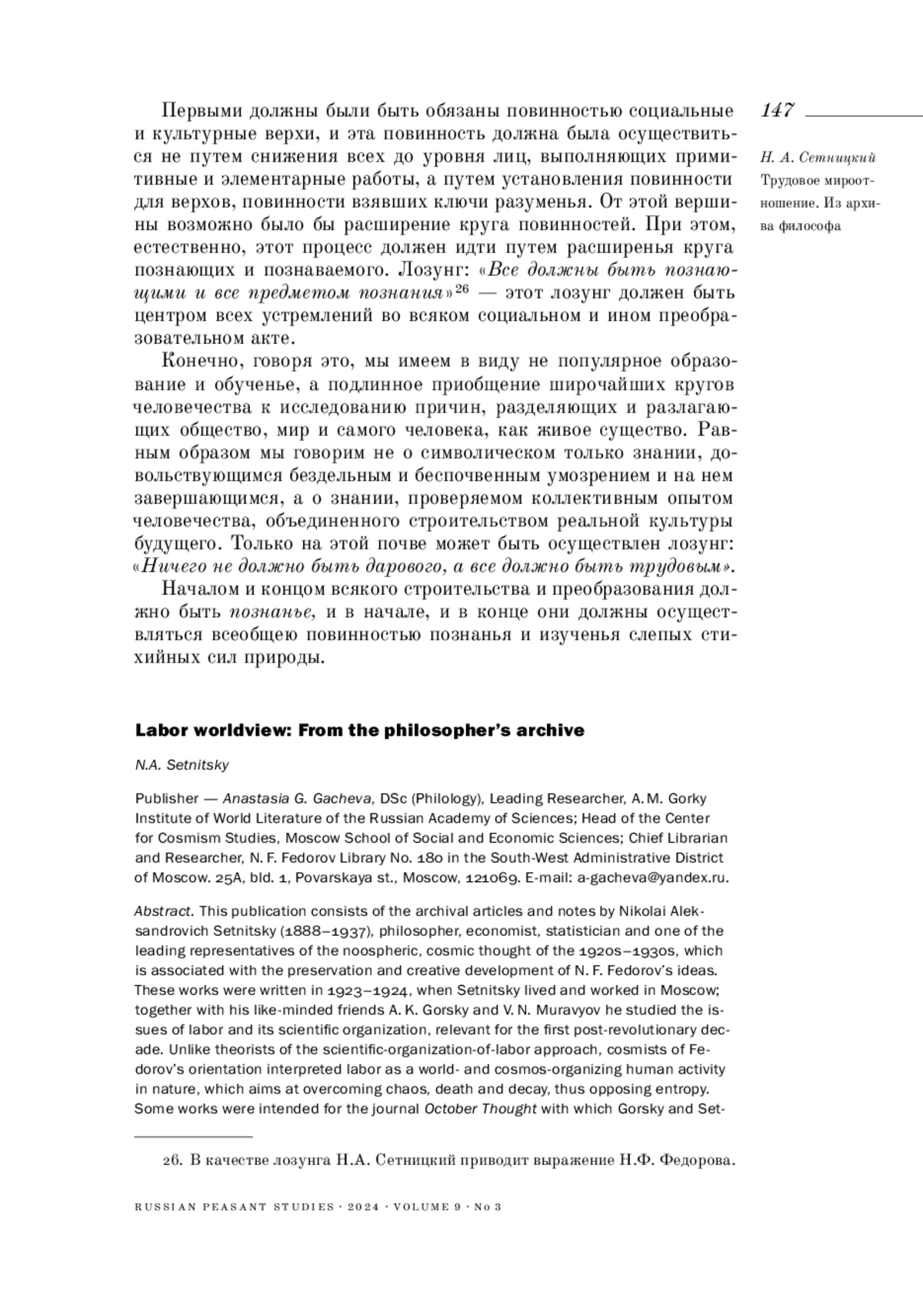 В настоящую публикацию включены архивные статьи и заметки Николая Александровича Сетницкого (1888-1937), философа, экономиста, статистика, одного их ведущих представителей той линии ноосферной, космической мысли 1920-1930-х гг., которая связана с продолжением и творческим развитием идей Н. Ф. Федорова. Публикуемые материалы относятся к 1923-1924 гг., когда Сетницкий жил и работал в Москве и совместно со своими друзьями-единомышленниками А. К. Горским и В. Н. Муравьевым занимался актуальной для первого пореволюционного десятилетия проблемой труда и научной организации труда. В отличие от теоретиков НОТ, мыслители-космисты федоровской ориентации трактовали труд как мироустроительную, космизующую и организующую деятельность человека в природе, направленную на преодоление хаоса, смерти, распада, как силу, противостоящую энтропии. Ряд публикуемых материалов предназначался для журнала «Октябрь мысли», с которым в 1924 г. активно сотрудничали Горский и Сетницкий. Размышления о цели труда соединялись с размышлениями о смысле культуры как благого возделывания и творческого преобразования мира. Статьи, связанные с проблемой трудового мироотношения, требующего активности человека в природе и противостоящего в этом смысле пассивно-потребительскому отношению к земле, выводили к выдвинувшейся в центр внимания для Сетницкого теме «Эксплуатация или регуляция?», разработку которой он вел в специальной статье. В подтексте статей, предназначавшихся для советской аудитории, был практически нивелирован религиозно-философский план трактовки понятий регуляции, труда и культуры, возводившихся Сетницким к исполнению заповеди «обладания землей», к эсхатологическому пересозданию мира, но некоторые словесные и смысловые обороты намекали на источную активно-христианскую направленность мысли философа. Публикуемые тексты хранятся в составе харбинского архива Н. А. Сетницкого в собрании Fеdoroviana Pragensia Литературного архива Музея национальной письменности (Чешская Республика). Ф. 341.