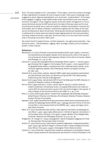 7. Дианова Е. В. (2019). Быт лесозаготовителей Европейского Севера (1920-е - начало 1930-х гг.) // Природно-географические факторы в повседневной жизни населения России: история и современность (региональный аспект). СПб.: ЛГУ им. А. С. Пушкина. С. 284-290. EDN: QNTPPW