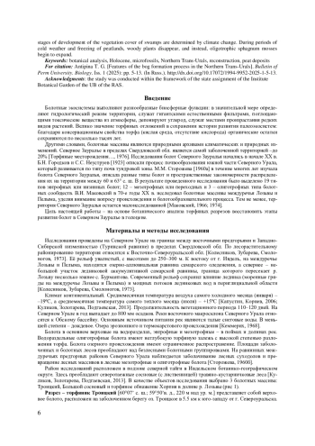 На основе палеоэкологических методов изучения торфяных отложений и радиоуглеродного датирования рассмотрены этапы развития болот в Северном Зауралье в голоцене. Проведенные исследования позволили детально реконструировать историю развития болотной растительности в Северном Зауралье, выявить катастрофические события, которые привели к смене растительных сообществ на болотах и увязать их со временем. В качестве объектов исследования выбрано 3 болотных массива: Троицкий, Большой сосновый и торфяное обнажение Хорпия в долине р. Лозьвы. Показано, что процессы заболачивания в Северном Зауралье начинались в разное время. На торфянике Троицкий торфонакопление началось около 8.0 тыс. лет назад, в Большом Сосновом - около 5.7 тыс. лет назад, в пойме р. Лозьвы (участок Хорпия) - около 5.4 тыс. лет назад. Основными путями заболачивания можно считать суходольное заболачивание лесов в понижениях рельефа и заболачивание послеледниковых озер. При заболачивании озер (Большое сосновое и Троицкое) торфообразование начинается с переходной стадии, с зарастания мелководий пушицей и сфагновыми мхами. При заболачивании елового леса в условиях застойного переувлажнения (торфяник Хорпия) торфообразование начинается с накопления древесного торфа. Этапы развития растительного покрова болот обусловлены климатическими изменениями. В теплые, сухие периоды на болотах развивается древесная растительность. В период похолодания и промерзания торфяников древесные растения исчезают, взамен начинается экспансия сфагновых олиготрофных мхов.
