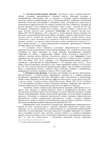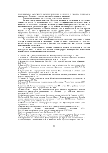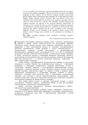 Статья посвящена анализу экзотической лексики, представленной в глянцевом журнале путешествий « Вояж ». Экзотизмы исследуются как языковой полифункциональный феномен, к которому реализуется широкий подход. В выпусках журнала за 2023-2024 гг. зафиксировано 130 экзотизмов. Они классифицированы по двум признакам: происхождение и семантика. Значения экзотизмов позволили выделить в текстах журнала-тревелога четыре тематических группы разной частотности: названия блюд и напитков ( 21 % ), названия природных и административно-территориальных объектов (5 4 % ), названия объектов сферы духовной культуры ( 14 % ), названия флоры и фауны ( 11 % ). В соответствии с этимологией экзотизмы дифференцированы на две группы: экзотизмы из национальных языков России ( 88 % ) и экзотизмы из официальных языков иных стран мира ( 12 % ). В первой подгруппе обнаружены экзотизмы из бурятского, калмыцкого, мансийского, чувашского, шорского языков; а во второй - английского, итальянского, казахского, китайского, немецкого, тайского, французского языков. Установлено, что в журнале-тревелоге экзотизмы выполняют четыре функции, три из которых являются универсальными, а одна - специфической. К универсальным функциям, характерным для экзотизмов и в текстах иных дискурсов, отнесены номинативная, эстетико-воздействующая и познавательная. А в качестве специфической, присущей экзолексемам именно в текстах журнала-тревелога, отмечена функция лингвистического инструмента создания конкурентной идентичности. Автор приходит к выводу, что экзотическая лексика журнала-тревелога « Вояж » позволяет отнести его к сегменту медиаресурсов, популяризирующих культурное наследие и способствующих оптимизации маркетинга территорий.