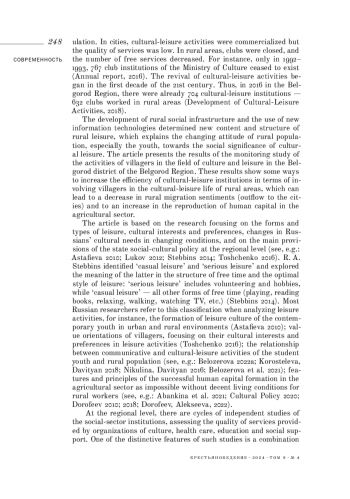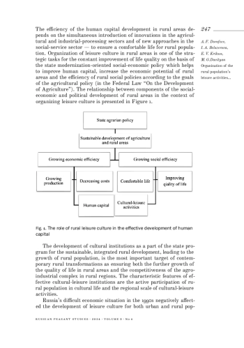 The efficiency of the human capital development in rural areas depends on the simultaneous introduction of innovations in the agricultural and industrial-processing sectors and of new approaches in the social-service sector — to ensure a comfortable life for rural population. Organization of leisure culture in rural areas is one of the strategic tasks for the constant improvement of life quality on the basis of the state modernization-oriented social-economic policy which helps to improve human capital, increase the economic potential of rural areas and the efficiency of rural social policies according to the goals of the agricultural policy (in the Federal Law “On the Development of Agriculture”). The relationship between components of the socialeconomic and political development of rural areas in the context of organizing leisure culture is presented in Figure
