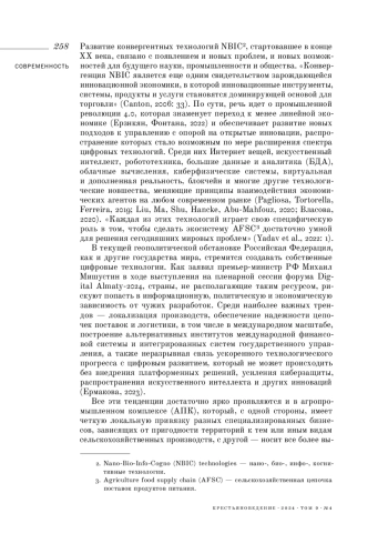 Развитие конвергентных технологий NBIC2, стартовавшее в конце ХХ века, связано с появлением и новых проблем, и новых возможностей для будущего науки, промышленности и общества. «Конвергенция NBIC является еще одним свидетельством зарождающейся инновационной экономики, в которой инновационные инструменты, системы, продукты и услуги становятся доминирующей основой для торговли» (Canton, 2006: 33). По сути, речь идет о промышленной революции 4.0, которая знаменует переход к менее линейной экономике (Ерзнкян, Фонтана, 2022) и обеспечивает развитие новых подходов к управлению с опорой на открытые инновации, распространение которых стало возможным по мере расширения спектра цифровых технологий. Среди них Интернет вещей, искусственный интеллект, робототехника, большие данные и аналитика (БДА), облачные вычисления, киберфизические системы, виртуальная и дополненная реальность, блокчейн и многие другие технологические новшества, меняющие принципы взаимодействия экономических агентов на любом современном рынке (Pagliosa, Tortorella, Ferreira, 2019; Liu, Ma, Shu, Hancke, Abu-Mahfouz, 2020; Власова, 2020). «Каждая из этих технологий играет свою специфическую роль в том, чтобы сделать экосистему AFSC3 достаточно умной для решения сегодняшних мировых проблем»