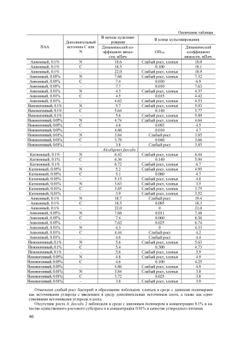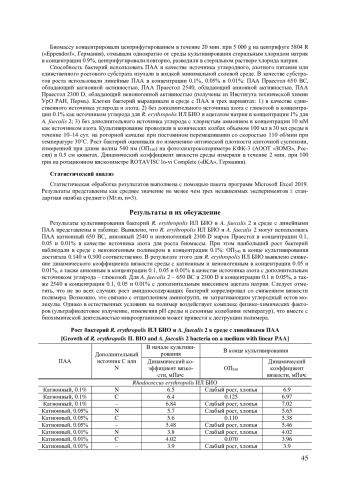 Изучена способность бактериальных штаммов Rhodococcus erythropolis ИЛ БИО и Alcaligenes faecalis 2, обладающих амидазной активностью, использовать линейные полиакриламиды (ПАА) марки Праестол 650 BC, 2540 и 2300 D в качестве источника углеродного или азотного питания. Определено, что штаммы бактерий использовали данные ПАА в концентрации 0.1, 0.05 и 0.01% в качестве источника азота для роста биомассы. При этом наибольший рост бактерий наблюдали на среде с ПАА Праестол 2300 D в концентрации 0.1%. Следует отметить, что не во всех случаях рост амидазосодержащих бактерий коррелировал со снижением вязкости полимера. Отсутствие роста A. faecalis 2 наблюдали на среде с анионным полимером в концентрации 0.1% в качестве единственного ростового субстрата и в концентрации 0.01% в качестве углеродного питания. Неионогенный и катионный ПАА подвергались более эффективной микробной деградации, чем анионный.