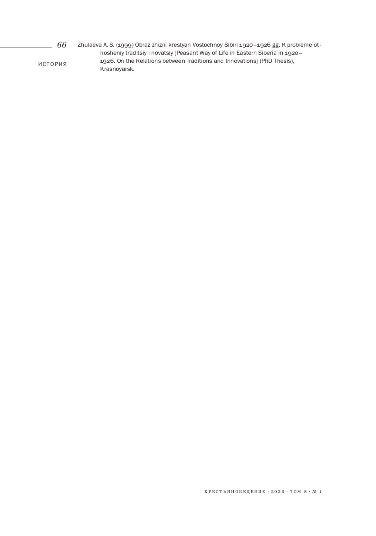 15. Жулаева А. С. (1999). Образ жизни крестьян Восточной Сибири 1920-1926 гг. К проблеме отношений традиций и новаций. Диссертация.. канд. ист. наук. Красноярск. EDN: QDCANF