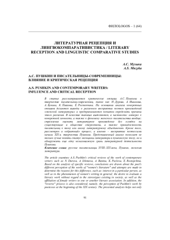 В статье рассматриваются критические отзывы А. С. Пушкина о творчестве писательниц-современниц, таких как Н. Дурова, А. Ишимова, А. Бунина, К. Павлова, Е. Ростопчина. На основании анализа конкретных отзывов делаются выводы о различном восприятии поэтом произведений «женской литературы» и предпринимаются попытки определить причины этого различия. В качестве таковых выделяются, в частности: интерес к конкретной личности, а также к феномену женского писательства вообще; стремление оценить литературное произведение без оглядки на существующие в обществе стереотипы, а также принадлежность писательниц к тому или иному литературному объединению. Кроме того, рассмотрен и «обратный» процесс, а именно - восприятие поэтессами начала XIX в. творчества Пушкина. Представленный анализ помогает не только лучше понять статус женщины-литератора в пушкинскую эпоху, но и обнаружить еще одну немаловажную грань литературной деятельности Пушкина.