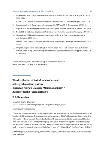 4. Карамышев Е. А. Скорость распада древнеанглийского синонимического ряда “scip/ship” и семантико-статистический генезис альфа-глоссем: автореф. дисс. … канд. филолог. наук. Магнитогорск: МГТУ им. Г. И. Носова, 2022. 22 с. EDN: XMSCUL