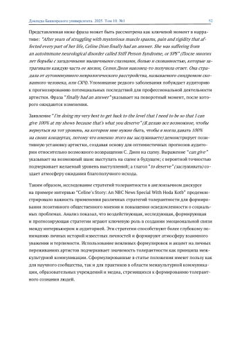 Статья посвящена толерантности как ключевому принципу коммуникации, исследуемому в англоязычном академическом сообществе. На основе интервью с певицей Селин Дион анализируются языковые приемы стратегий толерантности и их роль в публичных выступлениях. Актуальность работы обусловлена необходимостью изучения языкового воздействия и разработки эффективных механизмов межкультурного общения. Анализ показал значительный прагматический потенциал этих стратегий для формирования толерантного отношения между людьми.
