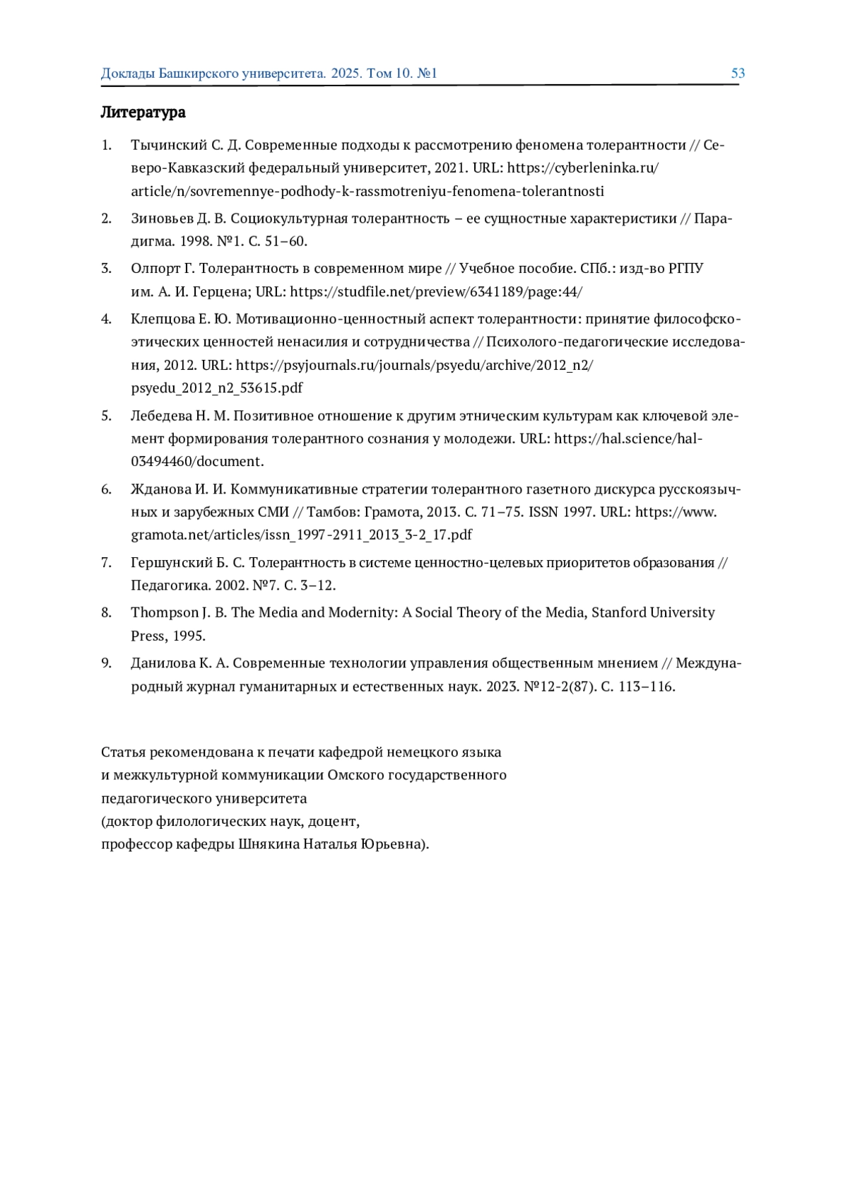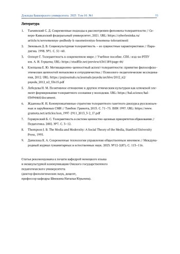 1. Тычинский С. Д. Современные подходы к рассмотрению феномена толерантности // Северо-Кавказский федеральный университет, 2021. URL: https://cyberleninka.ru/article/n/sovremennye-podhody-k-rassmotreniyu-fenomena-tolerantnosti.