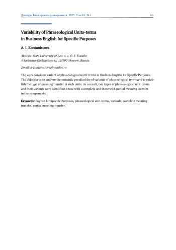 В данной статье рассматриваются варианты фразеологических единиц-терминов делового английского языка для специальных целей. Целью работы явился семантический анализ вариантов фразеотерминов с установлением степени переосмысления компонентного состава. В результате исследования было установлено, что варианты ФЕ-терминов могут демонстрировать как полное, так и частичное переосмысление компонентного состава.