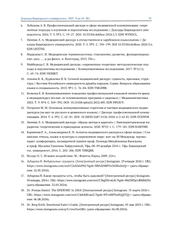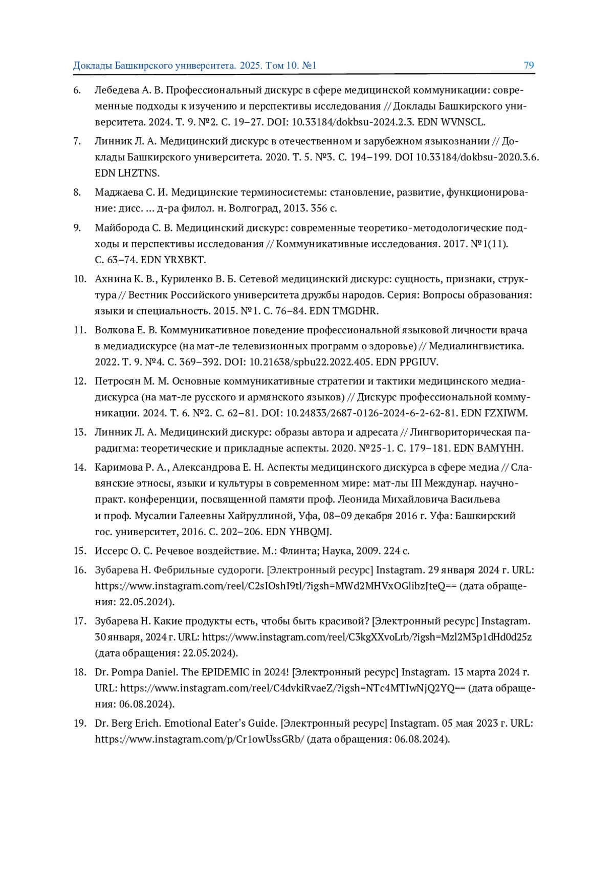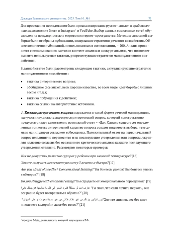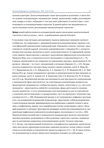 ПЕТРОСЯН М. М., ЛИННИК Л. А., АЛЬМАСРИ О. Н. РЕАЛИЗАЦИЯ СТРАТЕГИИ МАНИПУЛЯТИВНОГО ВОЗДЕЙСТВИЯ В МЕДИАМЕДИЦИНСКОМ ДИСКУРСЕ (НА МАТЕРИАЛЕ РАЗНОЯЗЫЧНЫХ БЛОГОВ ВРАЧЕЙ) // ДОКЛАДЫ БАШКИРСКОГО УНИВЕРСИТЕТА. 2025. Т. 10 № 1