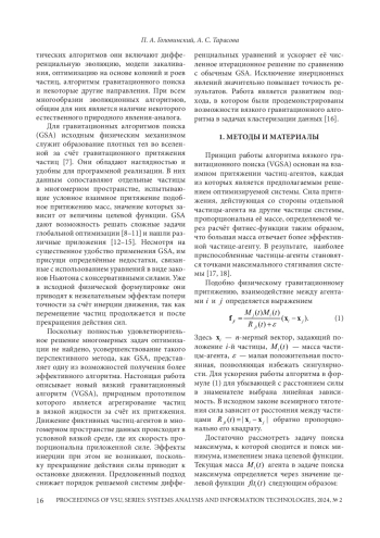 Для гравитационных алгоритмов поиска (GSA) исходным физическим механизмом служит образование плотных тел во вселенной за счёт гравитационного притяжения частиц [7]. Они обладают наглядностью и удобны для программной реализации. В них данным сопоставляют отдельные частицы в многомерном пространстве, испытывающие условное взаимное притяжение подобное притяжению масс, значение которых зависит от величины целевой функции. GSA дают возможность решать сложные задачи глобальной оптимизации [8–11] и нашли различные приложения [12–15]. Несмотря на существенное удобство применения GSA, им присущи определённые недостатки, связанные с использованием уравнений в виде законов Ньютона с консервативными силами. Уже в исходной физической формулировке они приводят к нежелательным эффектам потери точности за счёт инерции движения, так как перемещение частиц продолжается и после прекращения действия сил.