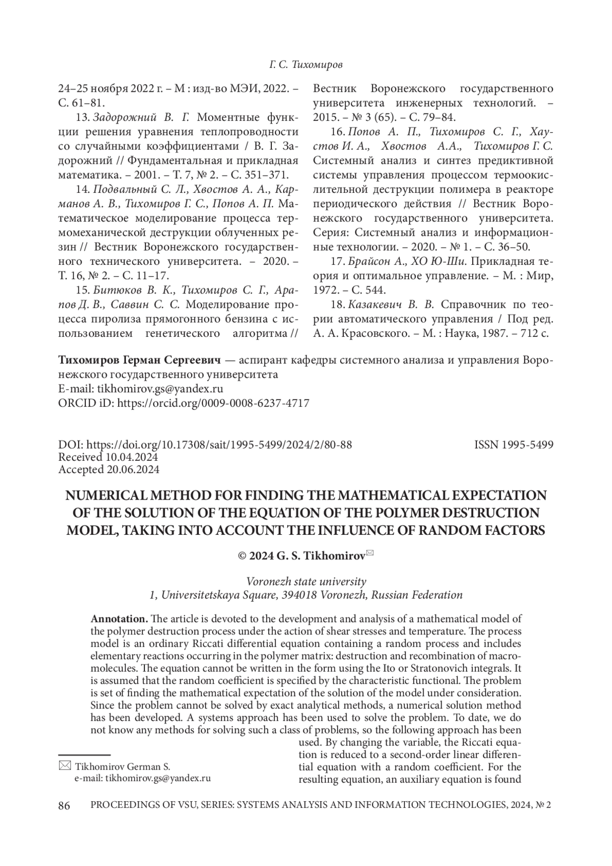 Осуществлена структурная и параметрическая идентификация модели процесса деструкции полимеров при термомеханических воздействиях. Решение модели осуществлено с использованием численного метода решения уравнения с обыкновенной и вариационной производными. Численные методы нахождения математического ожидания решения дифференциальных уравнений, которые записываются в форме Ито или Стратоновича, встречаются в литературе [10, 17, 18].