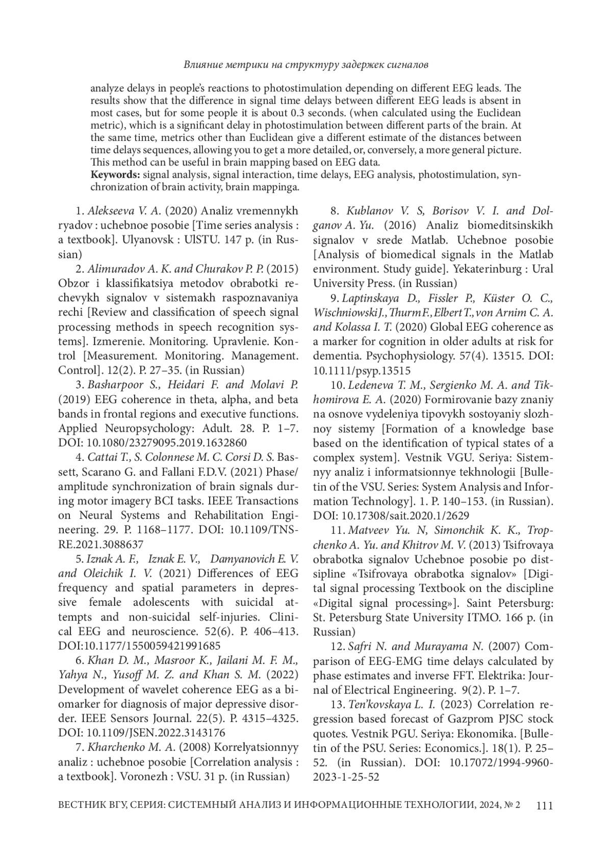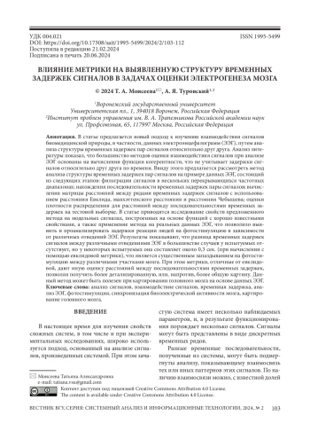 МОИСЕЕВА Т. А., ТУРОВСКИЙ Я. А. ВЛИЯНИЕ МЕТРИКИ НА ВЫЯВЛЕННУЮ СТРУКТУРУ ВРЕМЕННЫХ ЗАДЕРЖЕК СИГНАЛОВ В ЗАДАЧАХ ОЦЕНКИ ЭЛЕКТРОГЕНЕЗА МОЗГА // ВЕСТНИК ВОРОНЕЖСКОГО ГОСУДАРСТВЕННОГО УНИВЕРСИТЕТА. СЕРИЯ: СИСТЕМНЫЙ АНАЛИЗ И ИНФОРМАЦИОННЫЕ ТЕХНОЛОГИИ. 2024. № 2