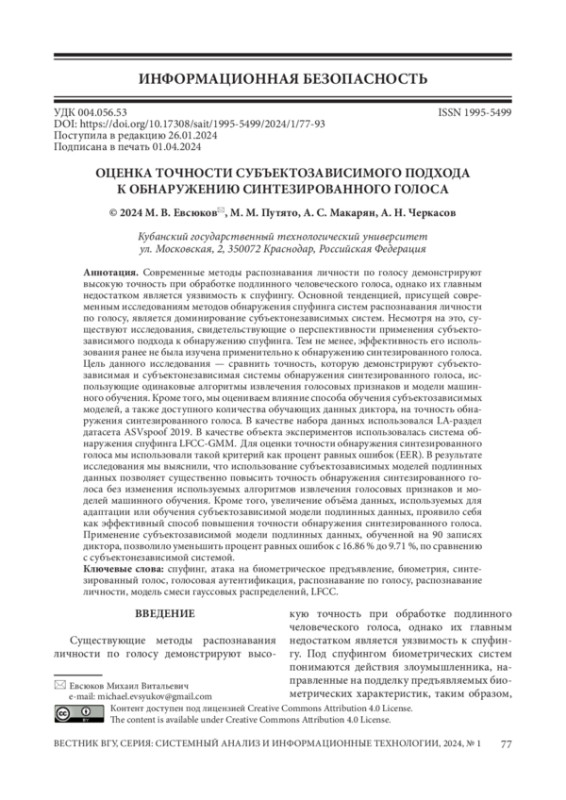 ЧЕРКАСОВ А. Н., ПУТЯТО М. М., ЕВСЮКОВ М. В., МАКАРЯН А. С. ОЦЕНКА ТОЧНОСТИ СУБЪЕКТОЗАВИСИМОГО ПОДХОДА К ОБНАРУЖЕНИЮ СИНТЕЗИРОВАННОГО ГОЛОСА // ВЕСТНИК ВОРОНЕЖСКОГО ГОСУДАРСТВЕННОГО УНИВЕРСИТЕТА. СЕРИЯ: СИСТЕМНЫЙ АНАЛИЗ И ИНФОРМАЦИОННЫЕ ТЕХНОЛОГИИ. 2024. № 1