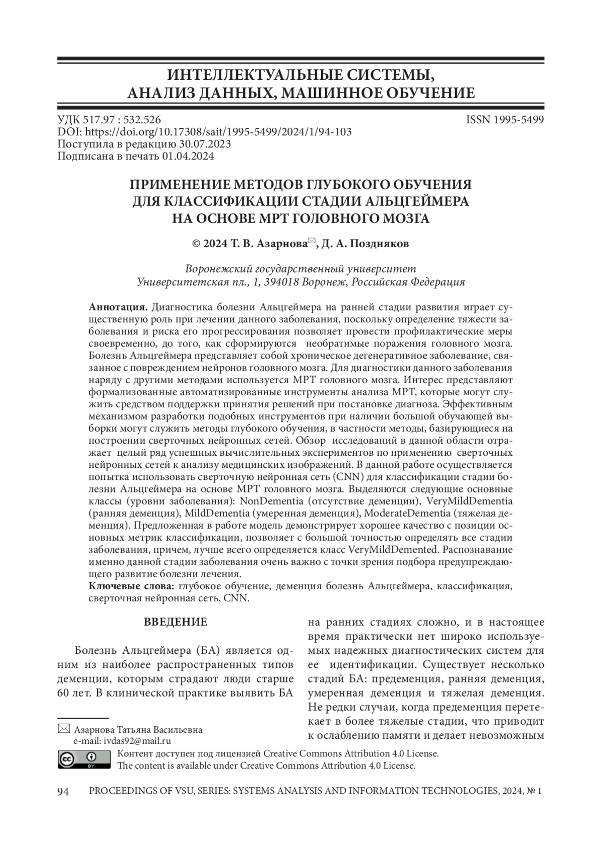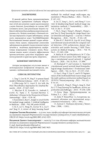 Диагностика болезни Альцгеймера на ранней стадии развития играет существенную роль при лечении данного заболевания, поскольку определение тяжести заболевания и риска его прогрессирования позволяет провести профилактические меры своевременно, до того, как сформируются необратимые поражения головного мозга. Болезнь Альцгеймера представляет собой хроническое дегенеративное заболевание, связанное с повреждением нейронов головного мозга. Для диагностики данного заболевания наряду с другими методами используется МРТ головного мозга. Интерес представляют формализованные автоматизированные инструменты анализа МРТ, которые могут служить средством поддержки принятия решений при постановке диагноза. Эффективным механизмом разработки подобных инструментов при наличии большой обучающей выборки могут служить методы глубокого обучения, в частности методы, базирующиеся на построении сверточных нейронных сетей. Обзор исследований в данной области отражает целый ряд успешных вычислительных экспериментов по применению сверточных нейронных сетей к анализу медицинских изображений. В данной работе осуществляется попытка использовать сверточную нейронная сеть (CNN) для классификации стадии болезни Альцгеймера на основе МРТ головного мозга. Выделяются следующие основные классы (уровни заболевания): NonDementia (отсутствие деменции), VeryMildDementia (ранняя деменция), MildDementia (умеренная деменция), ModerateDementia (тяжелая деменция). Предложенная в работе модель демонстрирует хорошее качество с позиции основных метрик классификации, позволяет с большой точностью определять все стадии заболевания, причем, лучше всего определяется класс VeryMildDemented. Распознавание именно данной стадии заболевания очень важно с точки зрения подбора предупреждающего развитие болезни лечения.