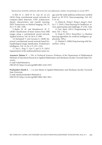 9. Badza M. M. and Barjaktarovic M. C. Classification of brain tumors from MRI images using a convolutional neural network // Applied Sciences. - 2020. - Vol. 10, No 6. - P. 1999. EDN: LPTQRP